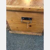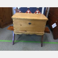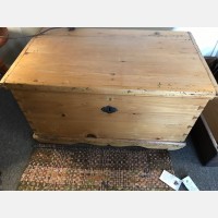 We are offering a honey pine chest, circa late 19th century. This chest offers curved "sleigh" skirt and feet, mortised chest locks, strike plate with brass keyhole, original spear point strap iron hinges, interior document box with its own mortised chest lock and strike plate. It has opposing iron handles with the top having bread board sides.