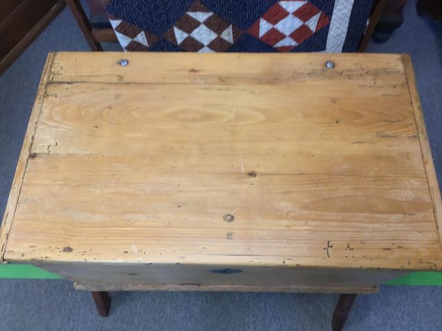 We are offering a honey pine chest, circa late 19th century. This chest offers curved "sleigh" skirt and feet, mortised chest locks, strike plate with brass keyhole, original spear point strap iron hinges, interior document box with its own mortised chest lock and strike plate. It has opposing iron handles with the top having bread board sides.
