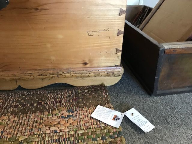 Construction was English. Most chests have a candle drawer or document compartment. Many have bracketed feet and dovetail construction. The hinged lid have mortised chest locks, strike plate and key holes. This was to protect valuables, ammunition, money and documents.