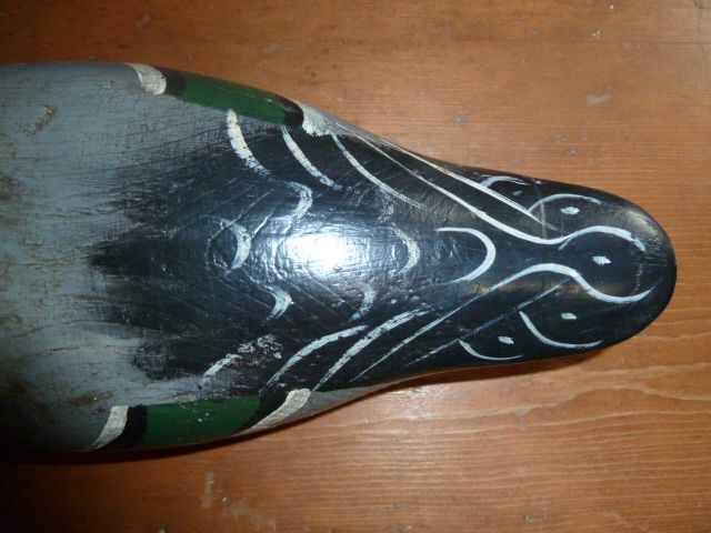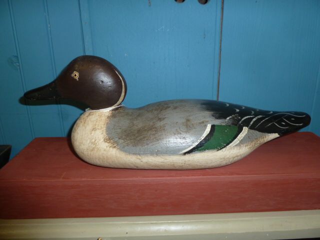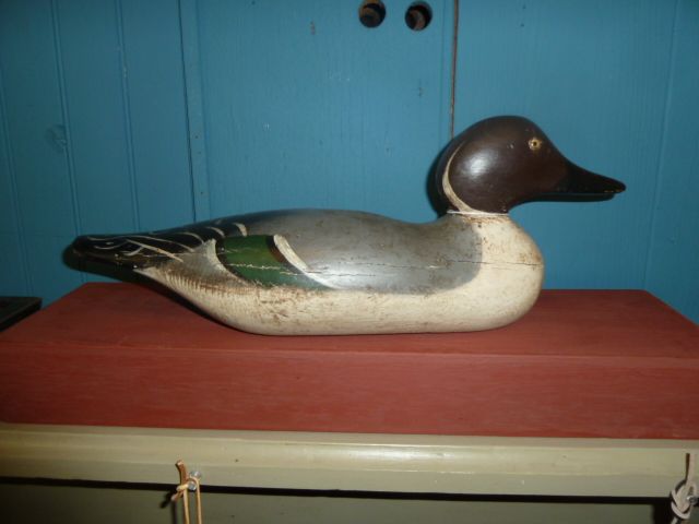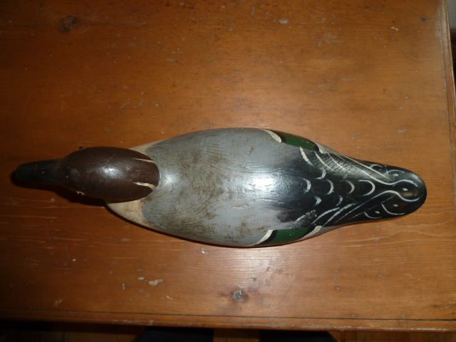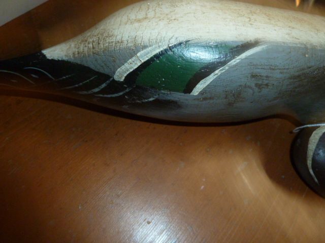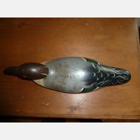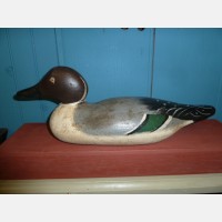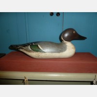 This decoy has a blackhead,grey back extending to black lower black and tail. It has an off white breast with a white swirl on either side of the neck extending up to the head. The underside is off white with wing feathers in a black,white and teal swirl on either side. The rear back to tail sports white feather lines. This is a Mason Standard Grade=plain carving,no head detail, yellow glass eyes, simple paint patterns, generally solid wood. It is in good condition with minor wear. The dimensions are 16"L AND 6 1/2"H.