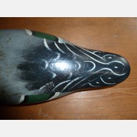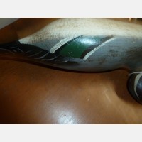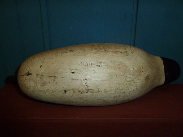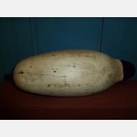 This decoy has a black bill with incised air holes,incised bill at top and end, and brown head with orange glass eyes. It has a black breast with a off white underside. There are black feather lines on either side and wing feathers on the top of white and brown over the black tail. This decoy has plain carving,no head detail, simple paint patterns, generally solid wood. It is an Evans Mammoth Style from Ladysmith, WI. It is in good condition with honest ware and minor paint loss. The dimensions are 18"L and 8"H.